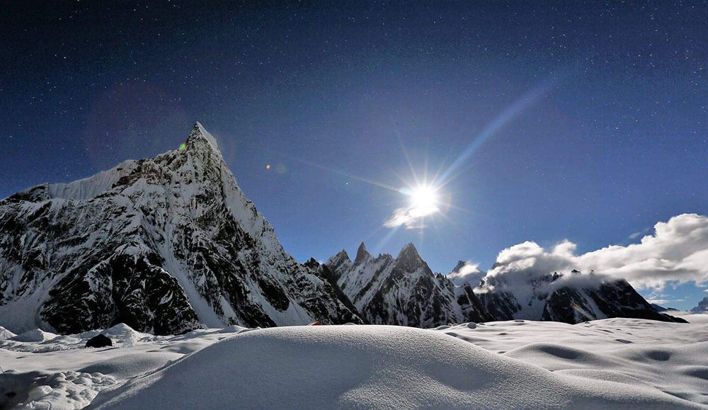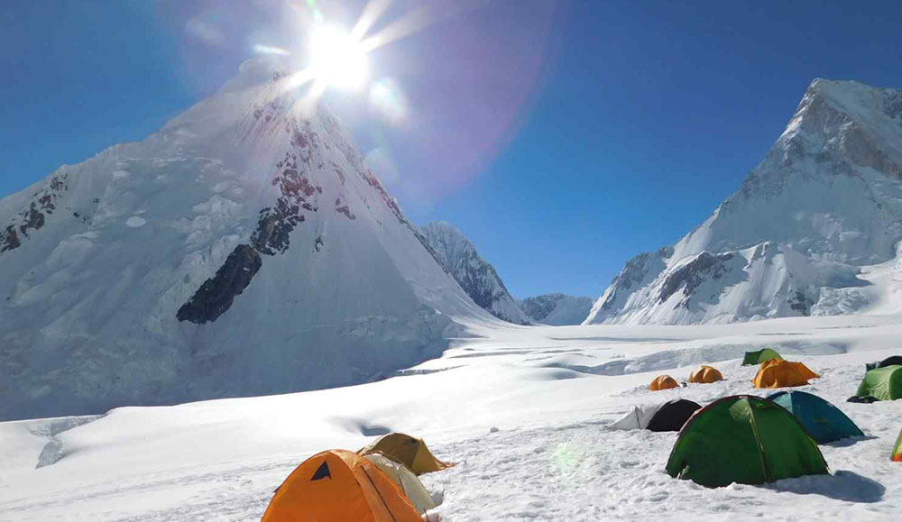 Trek for 5–6 hours toward the massive Mashabrum glacier and its awe-inspiring base camp. At 7,821 meters, Mashabrum is one of the most prominent peaks in the Karakoram, and its jagged form dominates the horizon. Explore the glacier and absorb the power of the landscape. Overnight in tents.